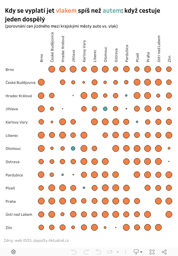 "Auta stojí, vlaky jedou," tvrdí legendární slogan Českých drah. Datová redakce Aktuálně.cz se podívala, zda platí i dnes. Spočítala, kde se vyplatí cestovat mezi krajskými městy po silnici a kde po železnici. A to jak z pohledu úspory času, tak i peněz. Výsledek?