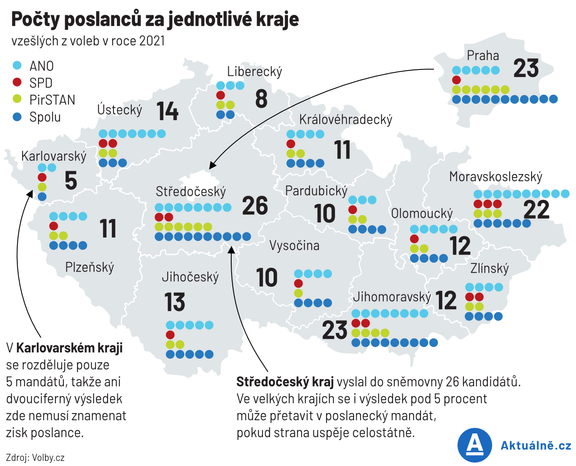 Jenže i za těchto (z pohledu úspěšných stran) ideálních podmínek to znamenalo, že hnutí ANO stačilo k zisku jednoho mandátu 20 252 hlasů, zatímco SPD jich potřebovala 25 696. Karlovarští voliči SPD měli tentokrát štěstí, že zrovna v jejich kraji, kde se rozděluje pouhých pět mandátů, strana Tomia Okamury překročila hranici 11,5 procenta hlasů, takže na ni jedno křeslo zbylo. Kdyby na Karlovarsku měla jen deset procent hlasů jako v sousedním Plzeňském kraji, nezískala by žádné.