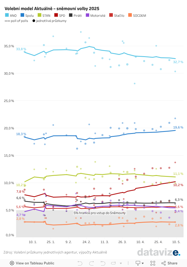 Pokud by se parlamentní volby konaly nyní, vyhrálo by je s 32,8 procenta hlasů hnutí ANO. Předpovídá to průzkum průzkumů sestavovaný redakcí Aktuálně.cz na základě výsledků téměř třech desítek volebních modelů, které letos publikovaly renomované agentury. Strana Andreje Babiše by tak v nové sněmovně měla 80 poslanců, o osm více než dnes.