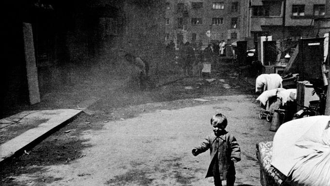 Opuštěné dítě mezi vystěhovaným nábytkem v Masné ulici v Praze 1. Květen 1945. Video animace historické fotografie pomocí umělé inteligence | Video: Aktuálně.cz / Umělá inteligence Kling AI / Prompt engineering: Dan Poláček
