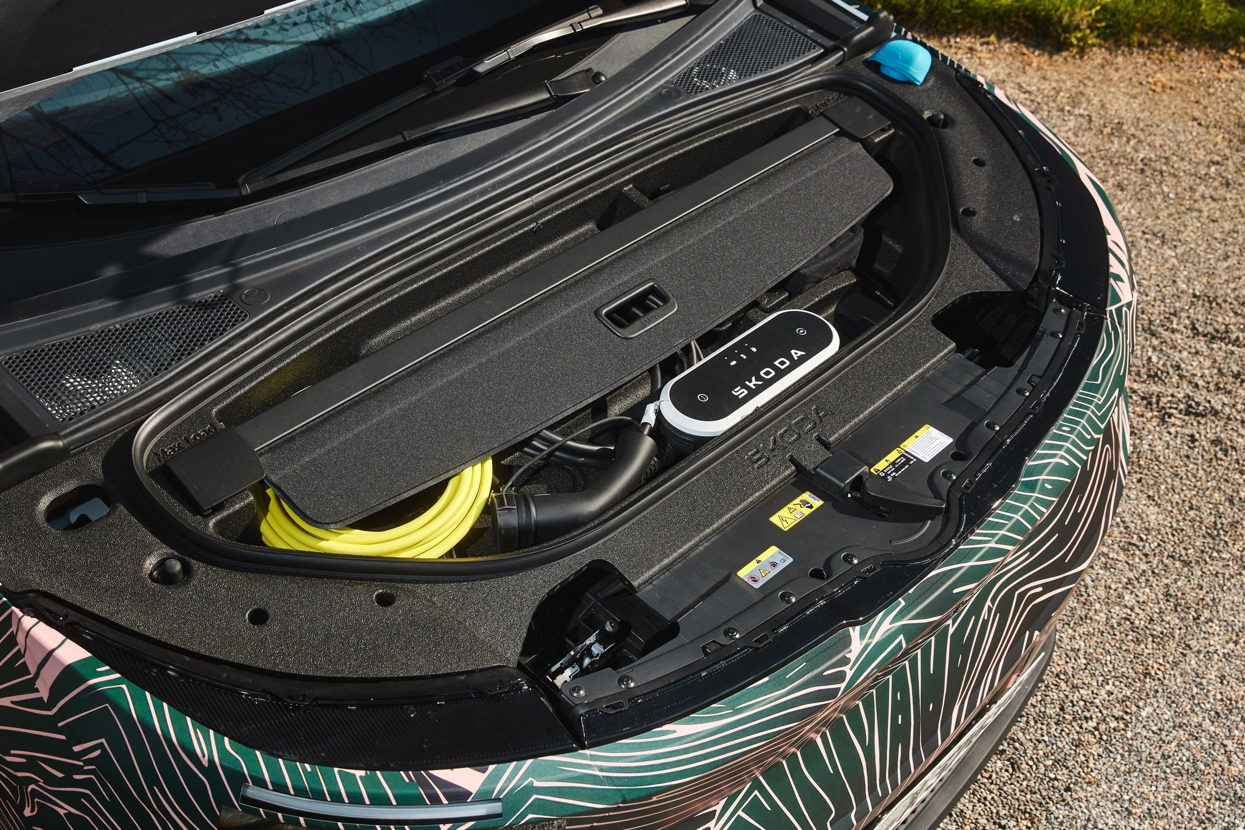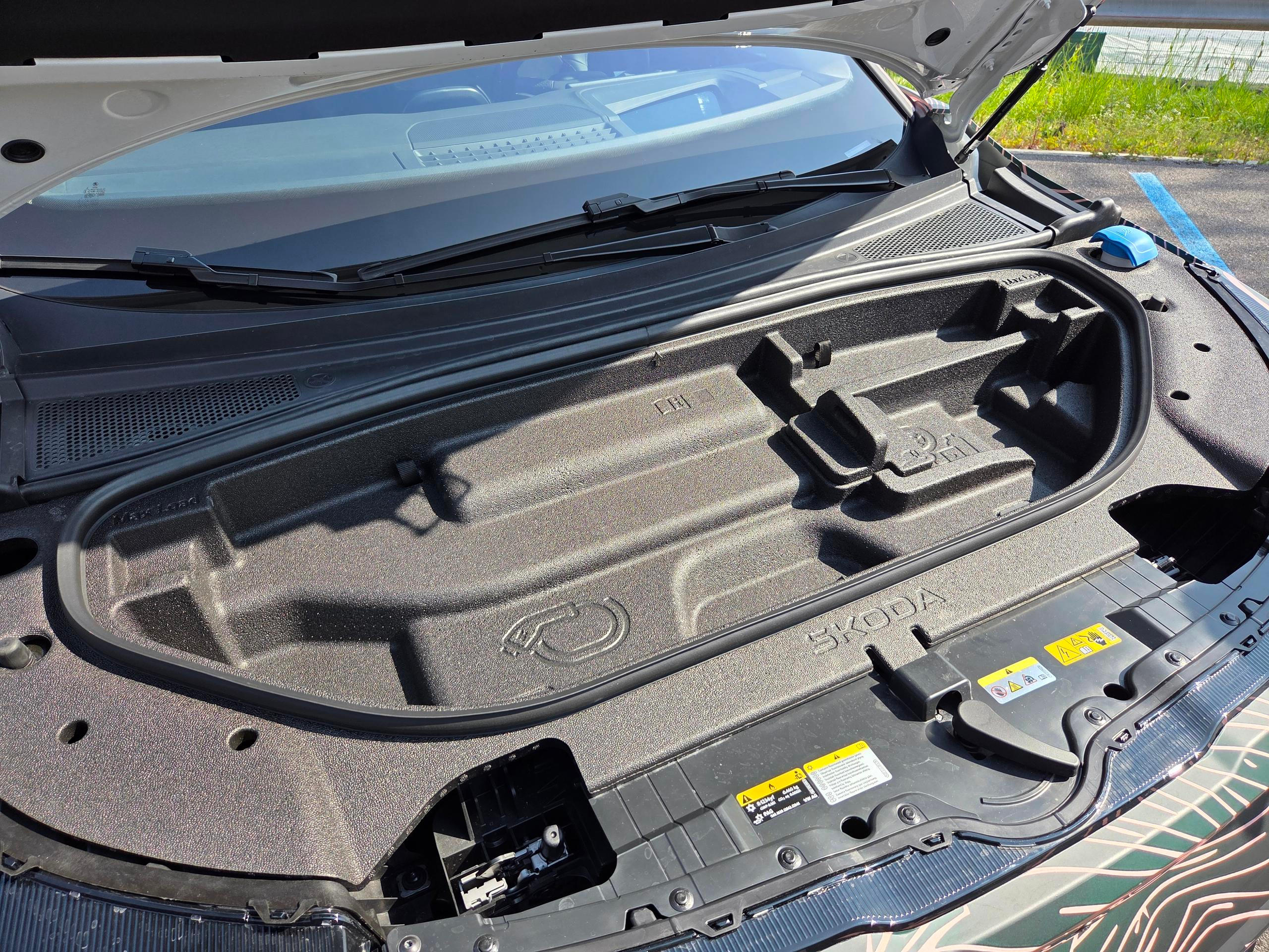 Pod přední kapotou se nachází frunk s objemem 37 litrů, který má speciální plato s výlisky na uložení kabelů nebo krycí roletky z kufru. Bez toho se dodávat nebude.