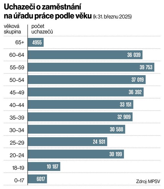 Že je zatím tahle část populace pro mnohé firmy neviditelná, ukazují i data o nezaměstnanosti: V červnu bylo bez práce téměř 316 tisíc lidí, přičemž více než třetina z nich - 110 tisíc - byli lidé přes 50 let. Ještě vyšší zastoupení mají lidé nad 50 let ve skupině těch, kdo práci marně hledají déle než rok. Takových lidí úřady celkem evidovaly více než 100 tisíc, přičemž zhruba polovinu tvořili padesátníci a starší.