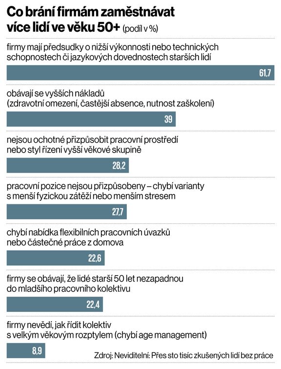 Poradenská skupina Moore Czech Republic mezi nimi provedla v červenci průzkum, v němž se ukázalo, že více než tři čtvrtiny z nich si myslí, že zaměstnanci starší 55 let mají na trhu práce znevýhodněné postavení. Pokud je uchazeči 60 a více let, může být věk hlavní překážkou k přijetí dokonce až podle 90 procent oslovených personalistů. Firmy tyto lidi přitom často opomíjejí kvůli zakořeněným věkovým stereotypům. Patří mezi ně například to, že tato generace je často považována za neflexibilní, za lidi, kteří neovládají technologie a brzy odejdou do důchodu. Skutečnost je ale mnohdy zcela opačná.