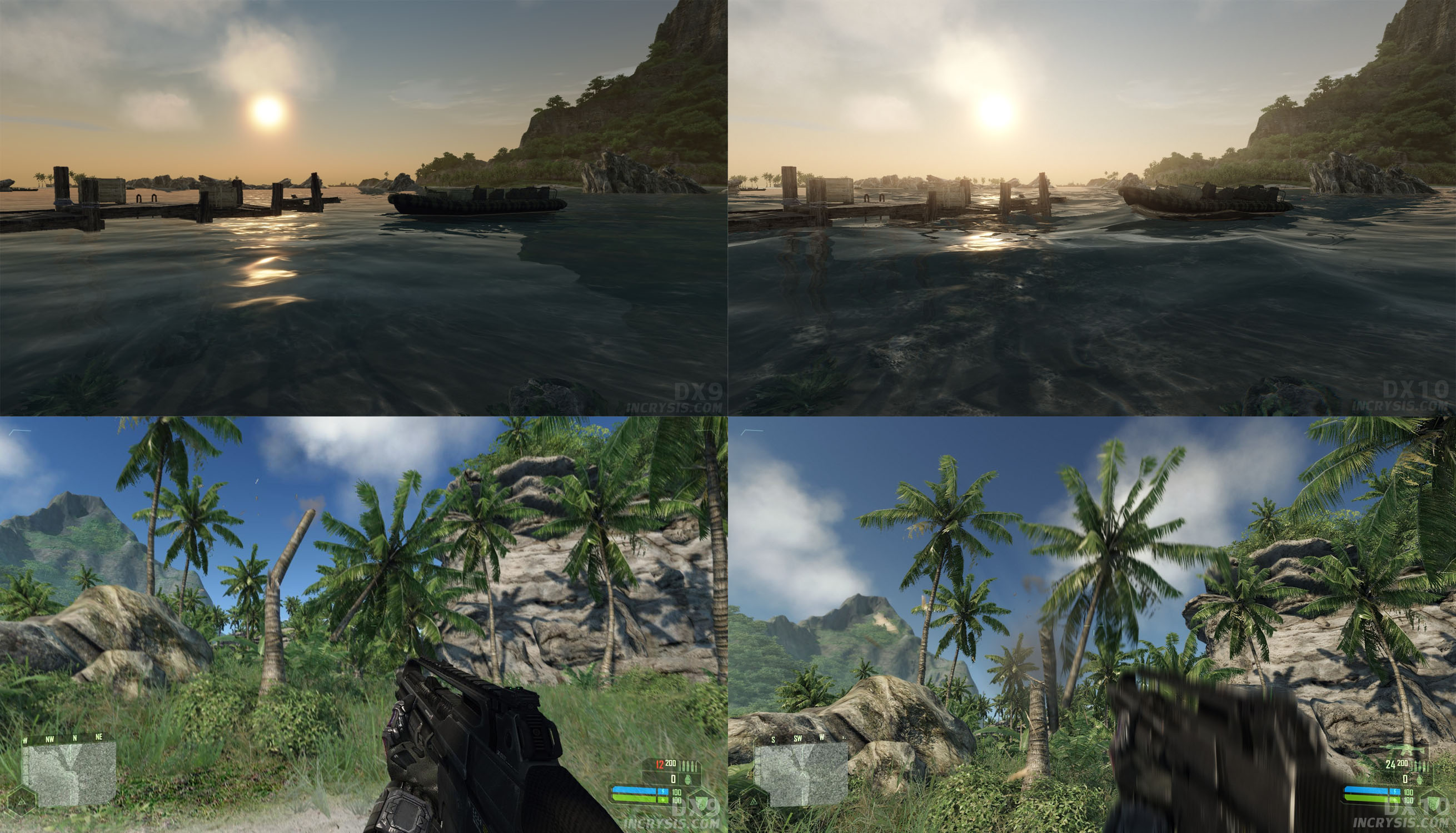 Fanstránky inCrysis.com pak zase přinesly několik obrázků, které porovnávají verzi pro DirectX 9.0 (vpravo) a DirectX 10.0 (vlevo). Poznáte mezi nimi rozdíl? Určitě tam nějaké drobnosti jsou, hlavně co se týká vodní hladiny a světla. Pro velký obrázek klikněte sem.