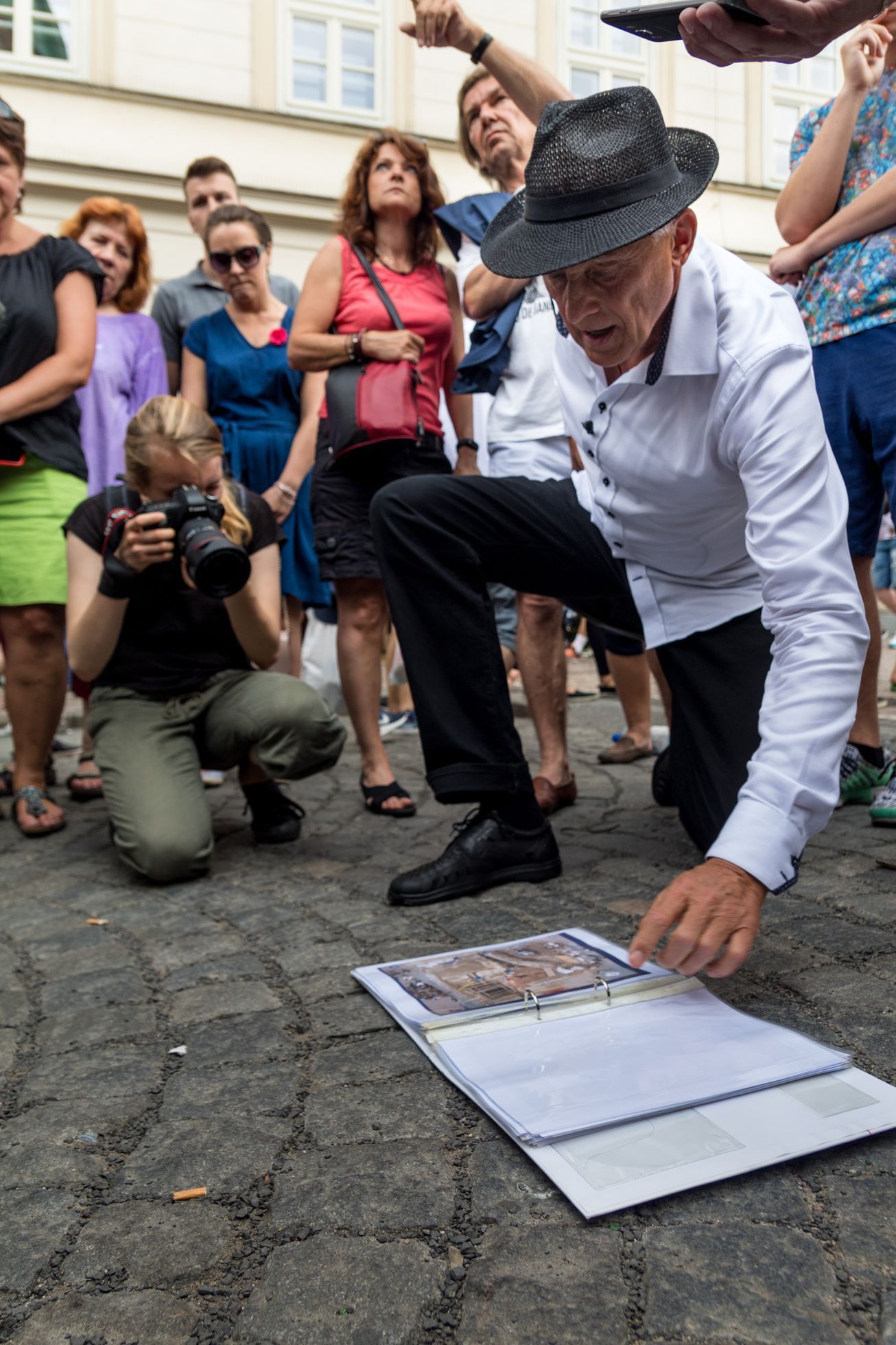Inženýr Zemánek na zemi ukazuje poslední ze tří možných umístění svatováclavského sloupu - je označeno zářezem v dlažební kostce.