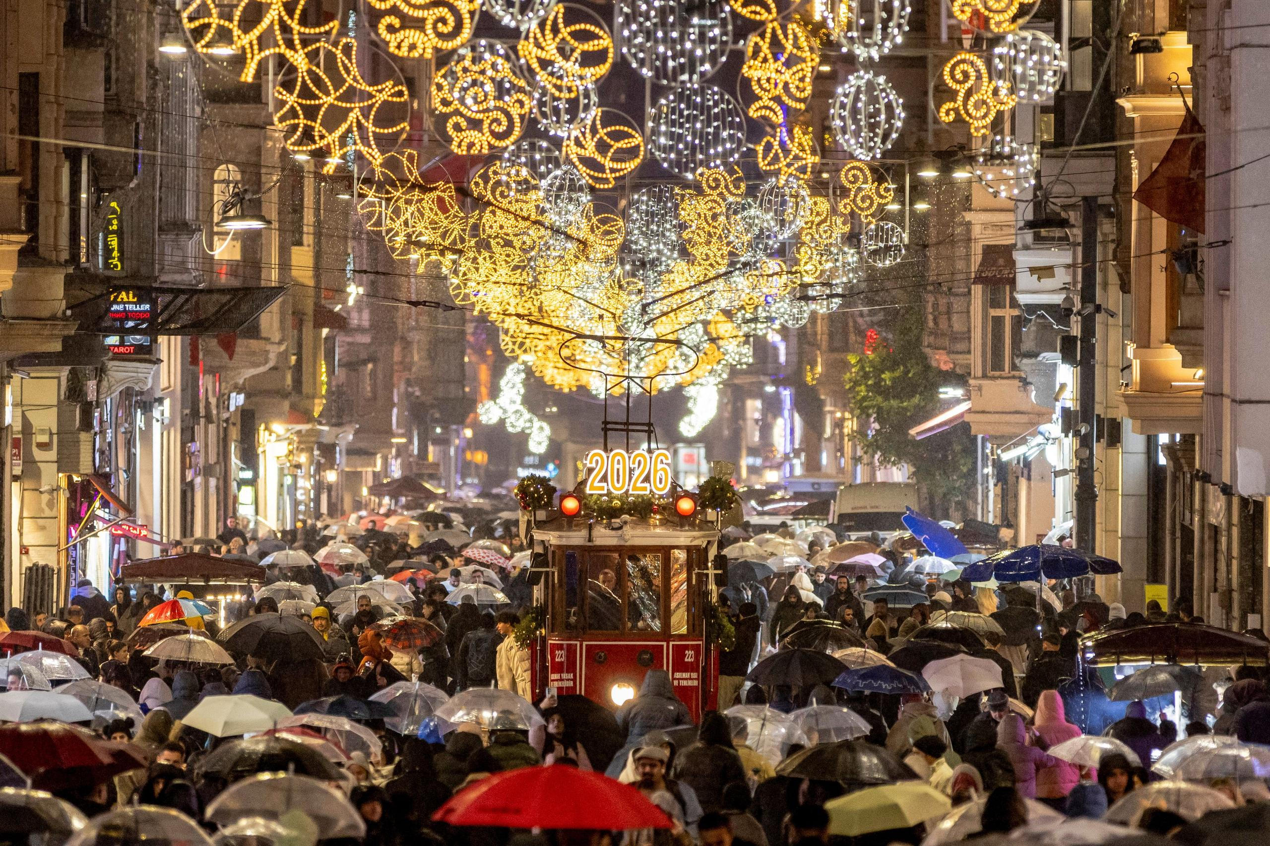 Historická tramvaj projíždí hlavní nákupní a pěší ulicí Istiklal, zdobenou novoroční výzdobou v centru Istanbulu.