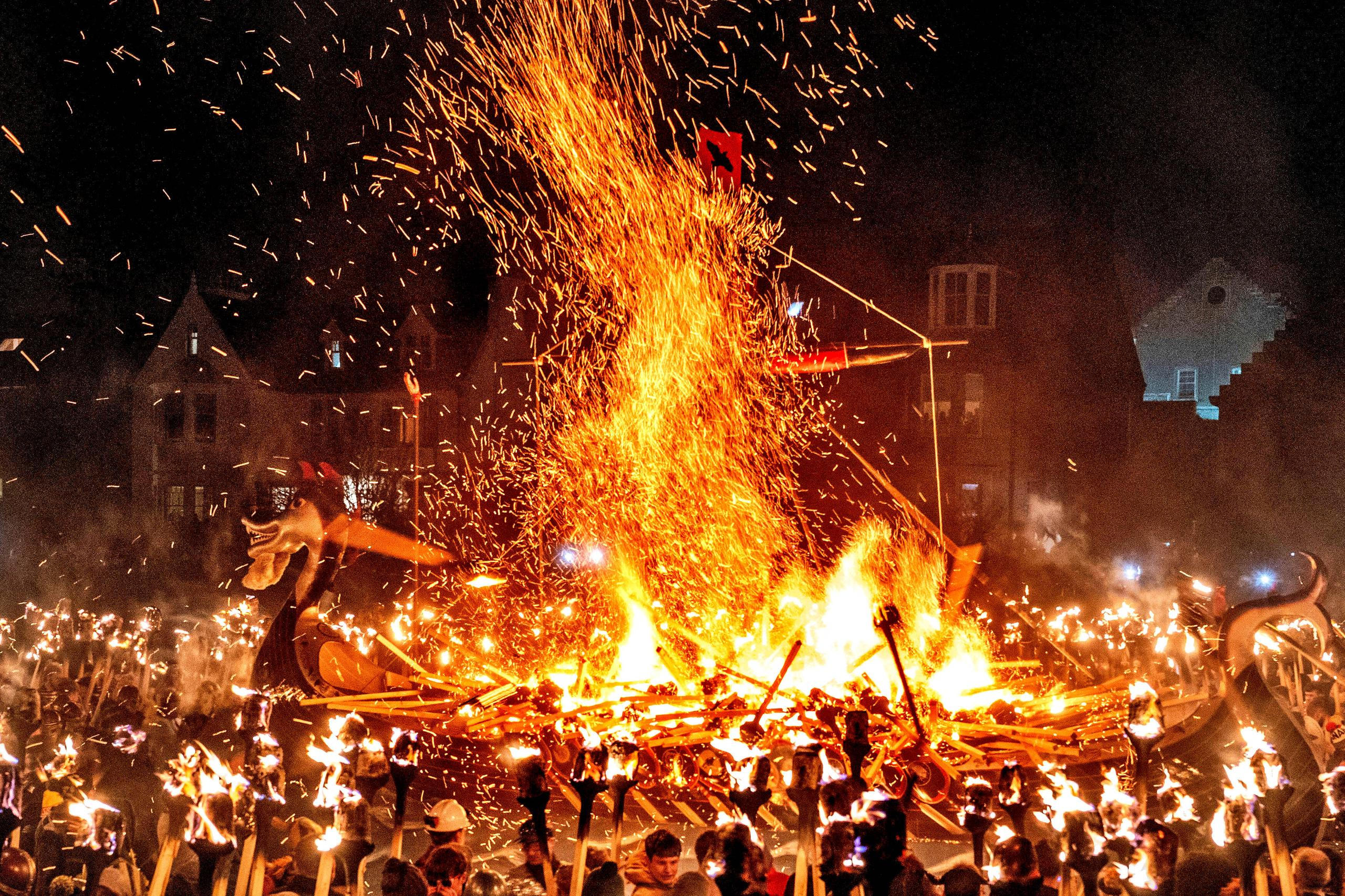 Ulice shetlandského Lerwicku hoří pochodněmi, tisíce plamenů tančí ve tmě, zatímco dav sleduje průvod guizerů (členů družiny převlečených za Vikingy), kteří se na chvíli stali dávnými hrdiny.