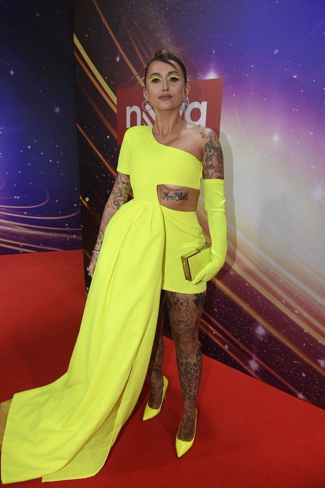 "Růžovou šeď" letošních Slavíků narušila odvážně raperka Sharlota, která na rozdíl od ostatních vsadila na neónově žlutou, a to od hlavy až k patě. Monochromní outfit držela pohromadě nejen kabelka a boty, ale také odpovídající oční stíny. Důmyslné průstřihy zase umožnily, aby bylo vidět Sharlotina početná tetování.