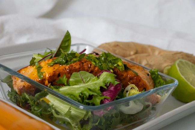 Listovou zeleninu vložte do misky nebo hlubokého talíře, položte na zeleninové lůžko filet lososa a přelijte zálivkou.