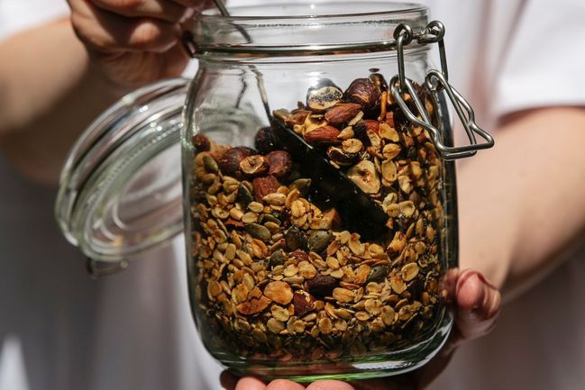 Rozprostřete granolu na plech vyložený pečicím papírem a vložte do předehřáté trouby. Pečte přibližně 20 minut, dokud nebudou ořechy i vločky krásně zlatavé. Během pečení občas promíchejte, ať se granola shora nepálí.