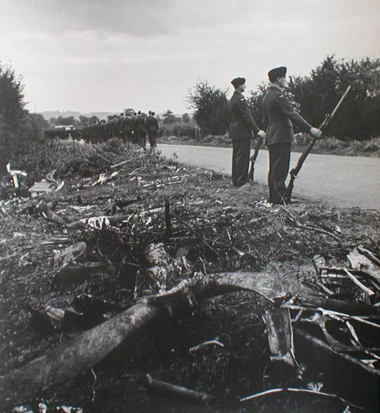 Smuteční fotografie 311. československé bombardovací perutě britského Královského letectva. Pohřební průvod míjí místo havárie jednoho z jejich letounů, bombardéru Wellington.
