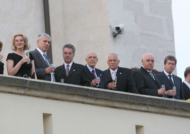 Prezidenti Srbska, Rakouska, Itálie, Česka, Albánie a Bulharska (zleva doprava) sledují přehlídku hradních stráží v dobových uniformách. Prezidenty sleduje nedobová bezpečnostní kamera.