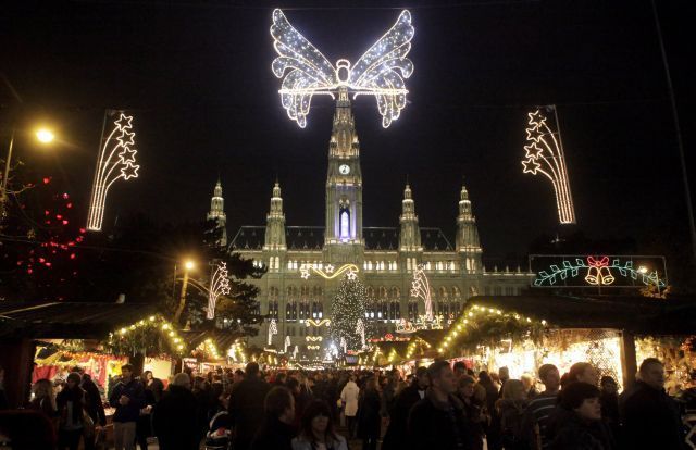 Wiener Christkindl Markt před budovou vídeňské radnice.