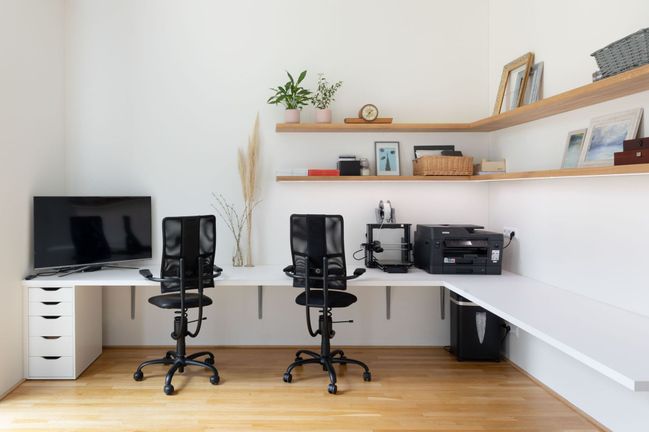 Přáním majitelů bylo mít v bytě i vlastní pracovnu. Tvoří ji černé kancelářské židle, bílý pracovní stůl a dubové police.