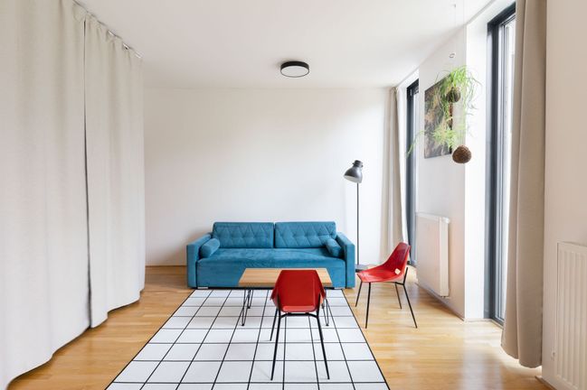V druhé části místnosti je sedací souprava v modré barvě a červené židle. Dohromady s originální podlahou vytvářejí barevnou kombinaci, která připomíná slavný obraz od nizozemského malíře Pieta Mondriana.