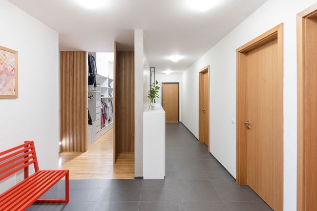 Dveře z chodby vedou do dalších pokojů a velké šatny, která vznikla uříznutím části společenské místnosti a jejím oddělením příčkou.