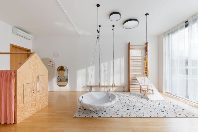 Další část pokoje slouží jako herna s tělocvičnou. Jsou tu barevné žíněnky, houpačka nebo žebřina se skluzavkou.