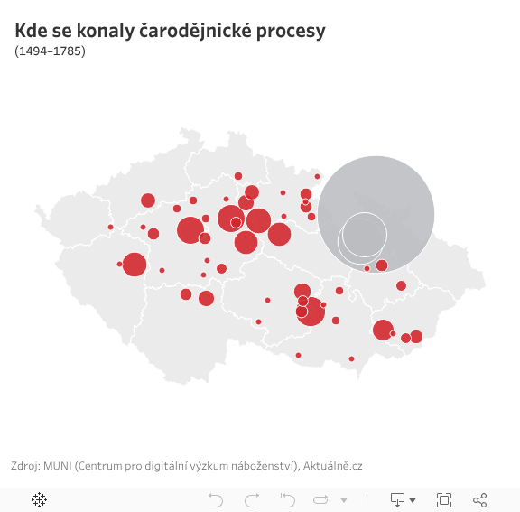 Část případů dopodrobna zanalyzovali výzkumníci Masarykovy univerzity. K dispozici jsou tak detailní údaje o více než dvou stovkách případů z patnáctého až osmnáctého století. Datová redakce Aktuálně.cz na jejich základě připravila podrobnou mapu. Zároveň do ní přidala i celková čísla za případy z Jesenicka, Šumperska a okolí Velkých Losin, které prozatím nejsou podrobně zmapovány. Výsledek? Celkem během procesů zahynulo v českých zemích přinejmenším pět set "čarodějnic".