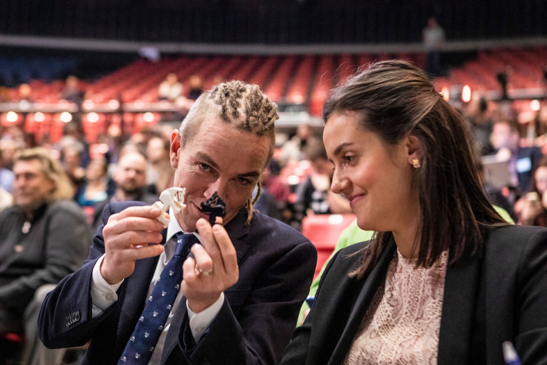 Bartoš od počátku akce hýřil sebevědomím a nepůsobil nervózně. Na volby předsedy už je ostatně zvyklý. Bartoš byl předsedou strany mezi říjnem 2009 a červnem 2013, následně krátce mezi zářím 2013 a červnem 2014 a poté od dubna 2016. Na snímku je s tiskovou mluvčí Pirátů Karolínou Sadílkovou.