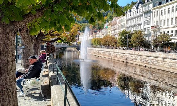Teď sem podle něj jezdí hlavně němečtí Rusové, kteří jsou "víc v pohodě". Krajské město je známé becherovkou, filmovým festivalem a svými horkými minerálními prameny, díky kterým jsou na západě Čech slavné lázně. A ty patří k hlavním zdrojům ekonomického příjmu, během pracovního dne na začátku října je poznat, že lidé procházející se v ulicích jsou spíš turisti, případně ze starší generace.
