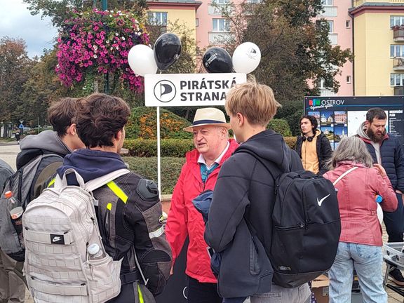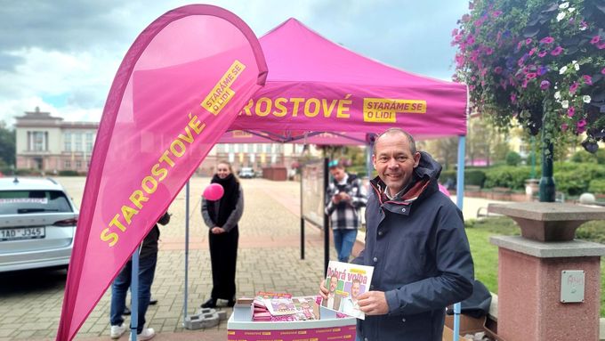 Hned o pár metrů dál v tu chvíli začal stavět svůj malý stánek lídr Pirátů Vladimír Votápek. Se "sousedy" se shodne na podobných problémech, které region má. "Nejhorší je propojení řady problémů - dopravou počínaje přes méně kvalifikovanou práci, zdravotnictví až po to, že věřím, že se třeba podaří přilákat nová fabrika, která přinese nové lidi," popisuje.