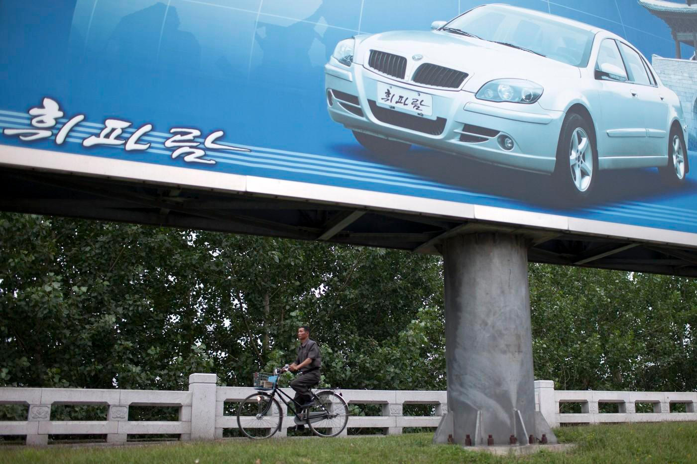 Zpráv o fungování automobilky Pyeonghwa (na billboardu model Hwiparam III, v pozadí showroom v Pchjongjangu) není mnoho, protože KLDR se po pandemii koronaviru izolovala více než obvykle. Podle posledních zpráv už v továrně ani auta nevznikají, místo nich zaujaly raketomety.