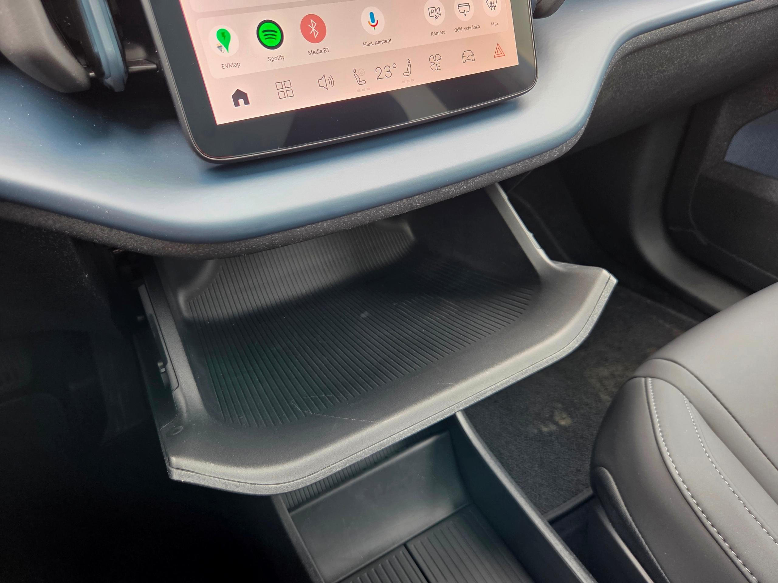 Odkládací schránka není před spolujezdcem, ale uprostřed palubní desky.