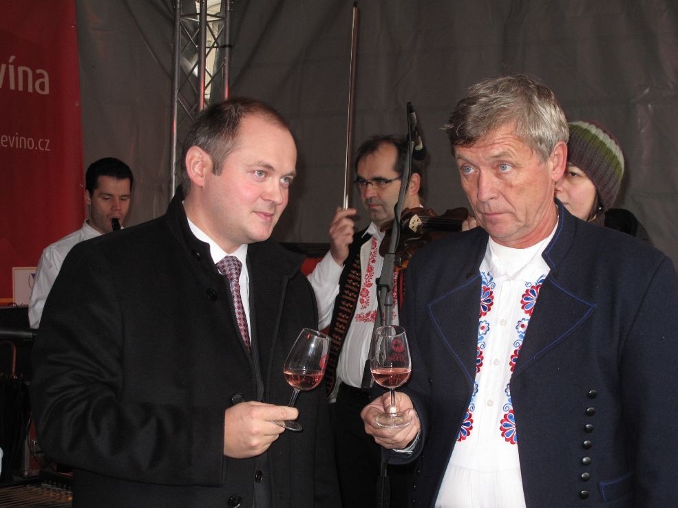 Ke Svatomartinskému patří i slavnostní proslovy. Jihomoravský hejtman Michal Hašek (vlevo) byl k moknoucím lidem v délce projevu milosrdný, stejně jako další politici na pódiu.