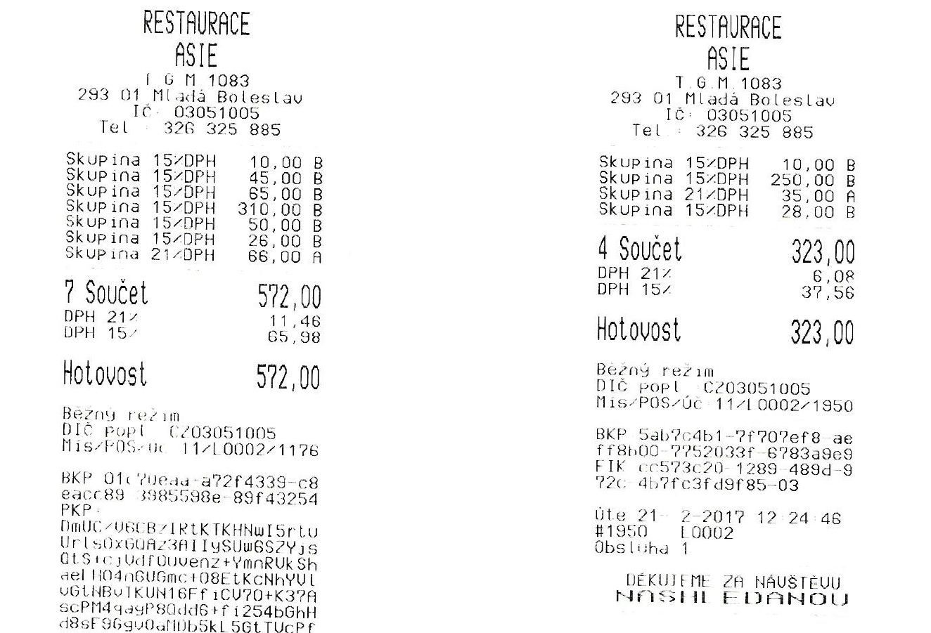 Co jsem měl dnes k obědu? Řádky informují jen o tom, pod kterou daňovou skupinu jednotlivé položky na účtence spadají, takže to mohly být třeba knedlíky se zelím, uzený na hráchu, vařené bravčové či buchtičky se šodó zapíjené vodó, jak o tom zpívá ve stejnojmenné písni Jiří Šlitr.