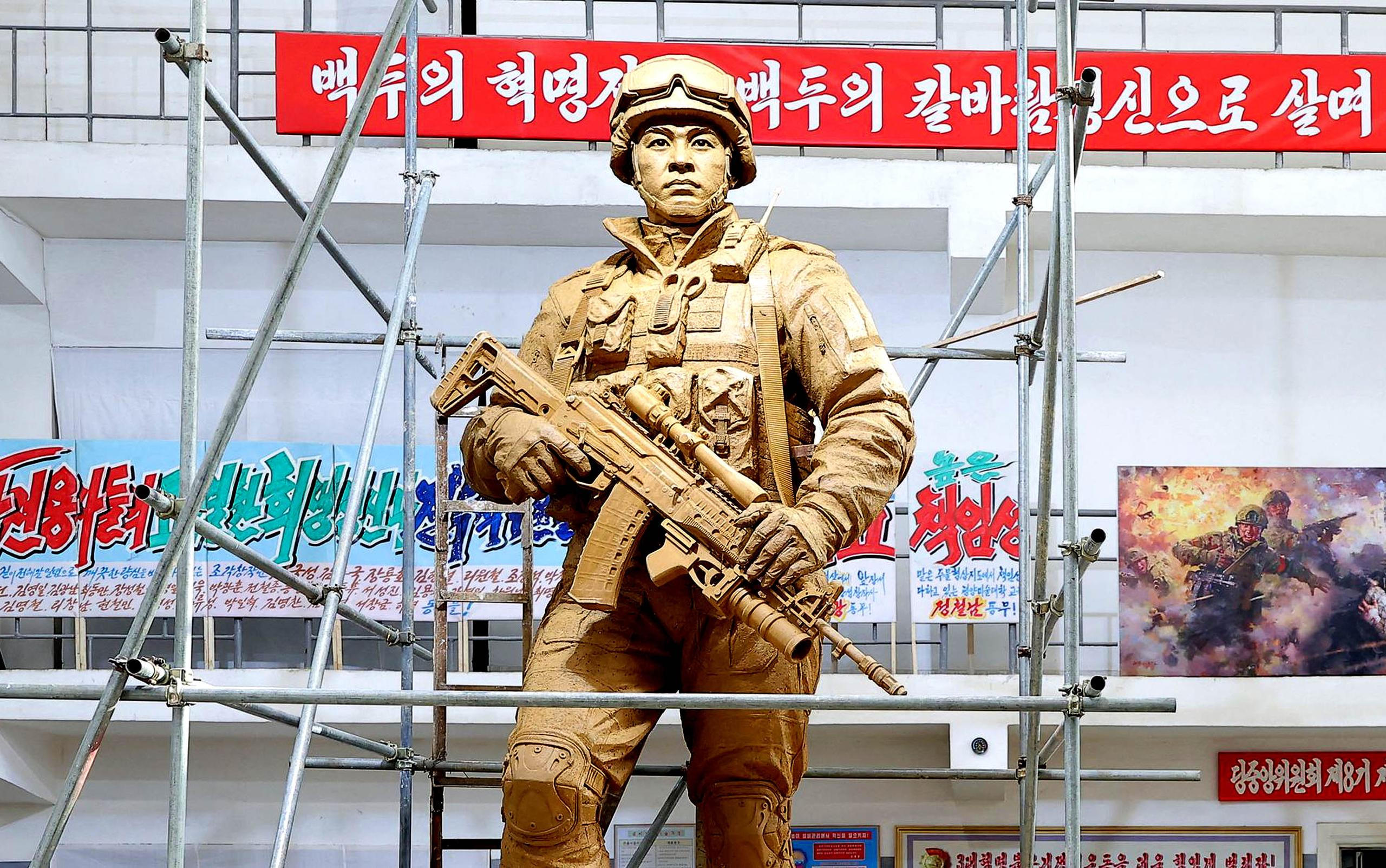 Fotografie uveřejněné státními médii zachycují zlatou sochu severokorejského vojáka v ruském vojenském vybavení. Drží útočnou pušku AK-12 s optickým zaměřovačem a granátometem pod hlavní. Tuto zbraň používaly severokorejské speciální jednotky v Kurské oblasti v Rusku.