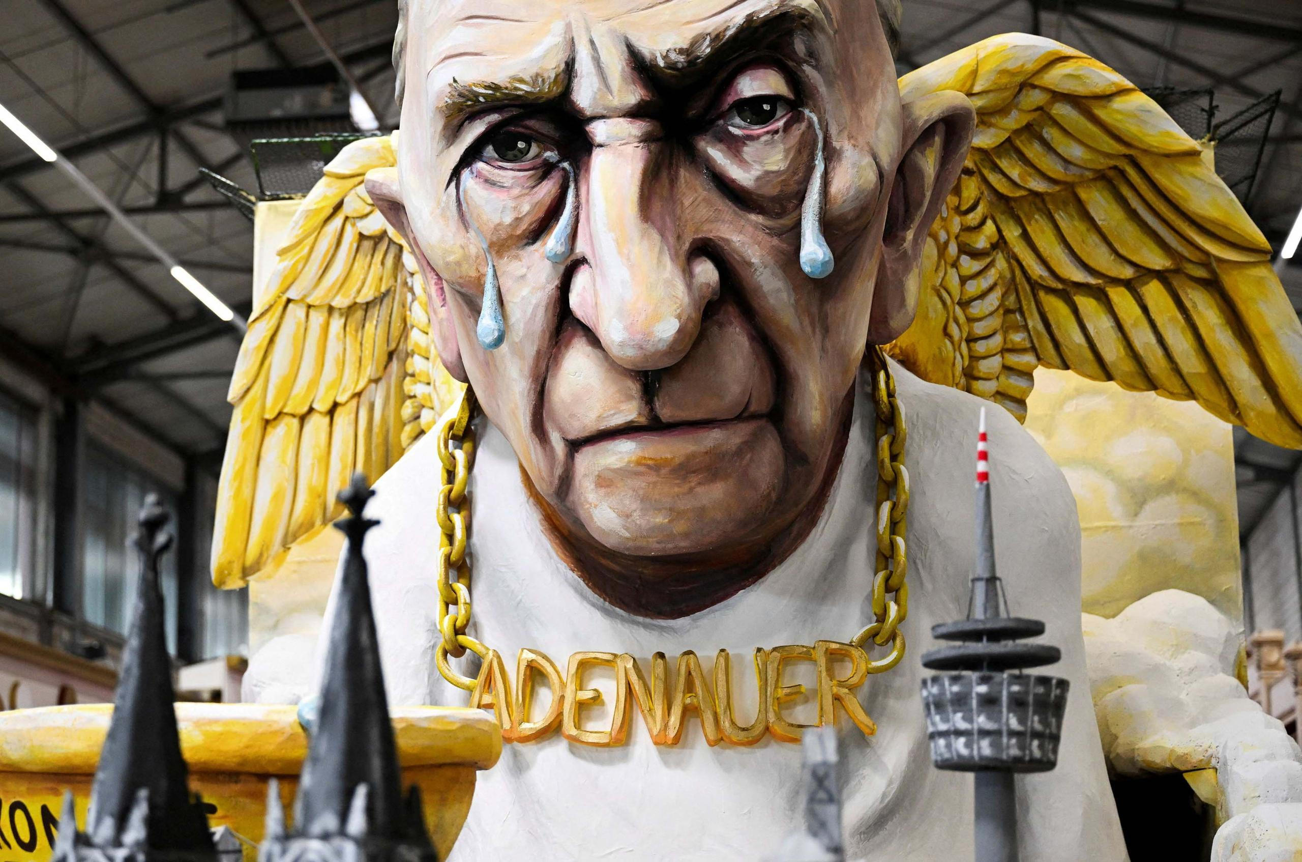 Pořadatelé v západoněmecké Mohuči v úterý představili sérii tradičně provokativních figur; na snímku je plačící bývalý kancléř Konrad Adenauer.