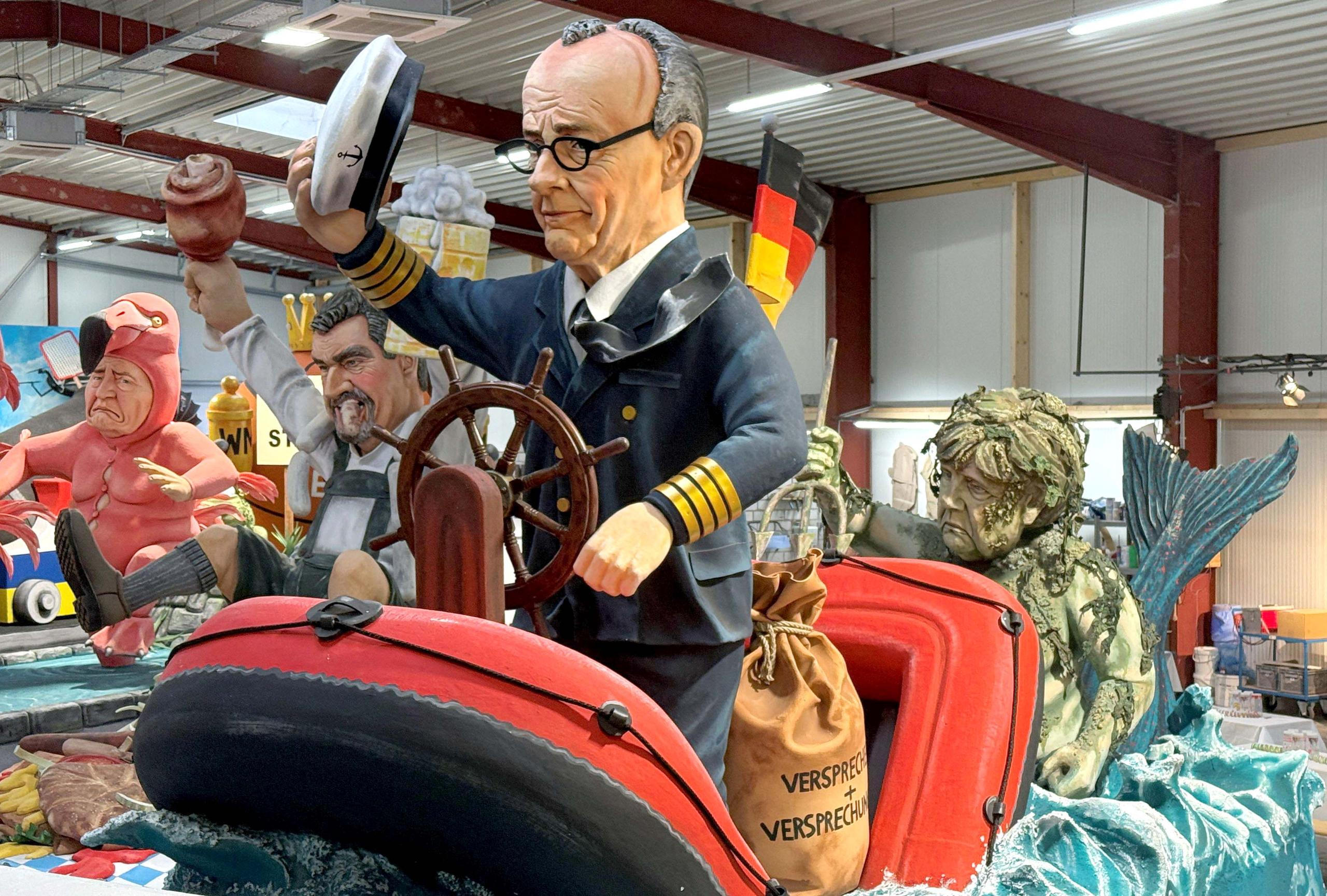 Další vůz zobrazuje bavorského premiéra Markuse Södera, známého tím, že na sociálních sítích často sdílí fotky svých jídel, jak sedí na hromadě klobás a sušených mas, přičemž mu jedna trčí z úst.