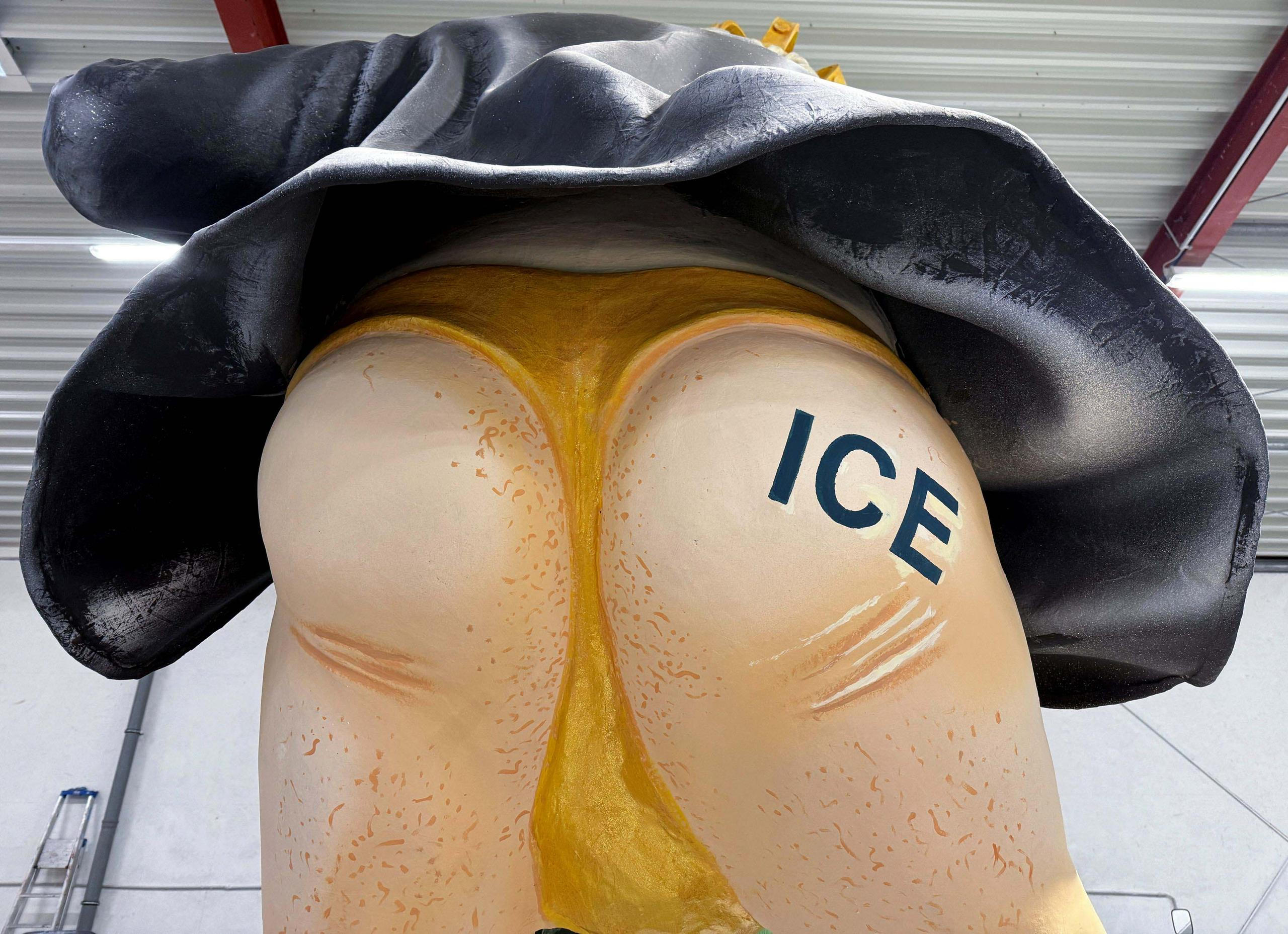 Trumpova figura má na pravé půlce pozadí nápis „ICE“, odkaz na americký imigrační úřad Immigration and Customs Enforcement, který aktuálně provádí kontroverzní zásahy proti přistěhovalcům ve Spojených státech.