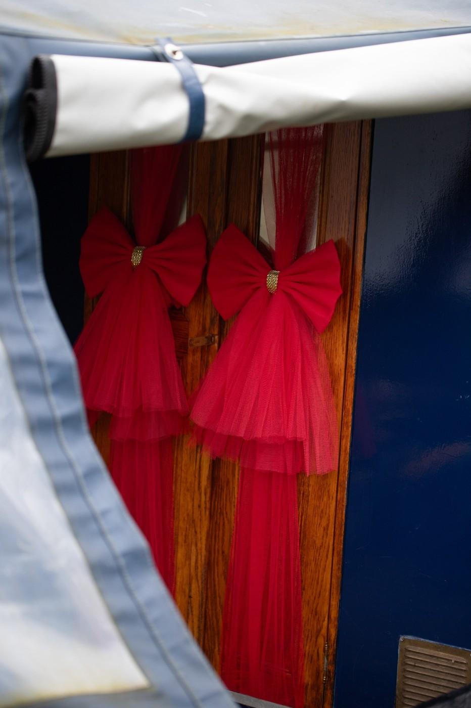 Klasický vánoční stromek se na loď nevejde, ale i s tím si poradili. „Zdobíme strop a kamarádka nám vyrobila mašle na míru pro naše maličké dveře. Je to neuvěřitelně útulné místo na svátky.“
