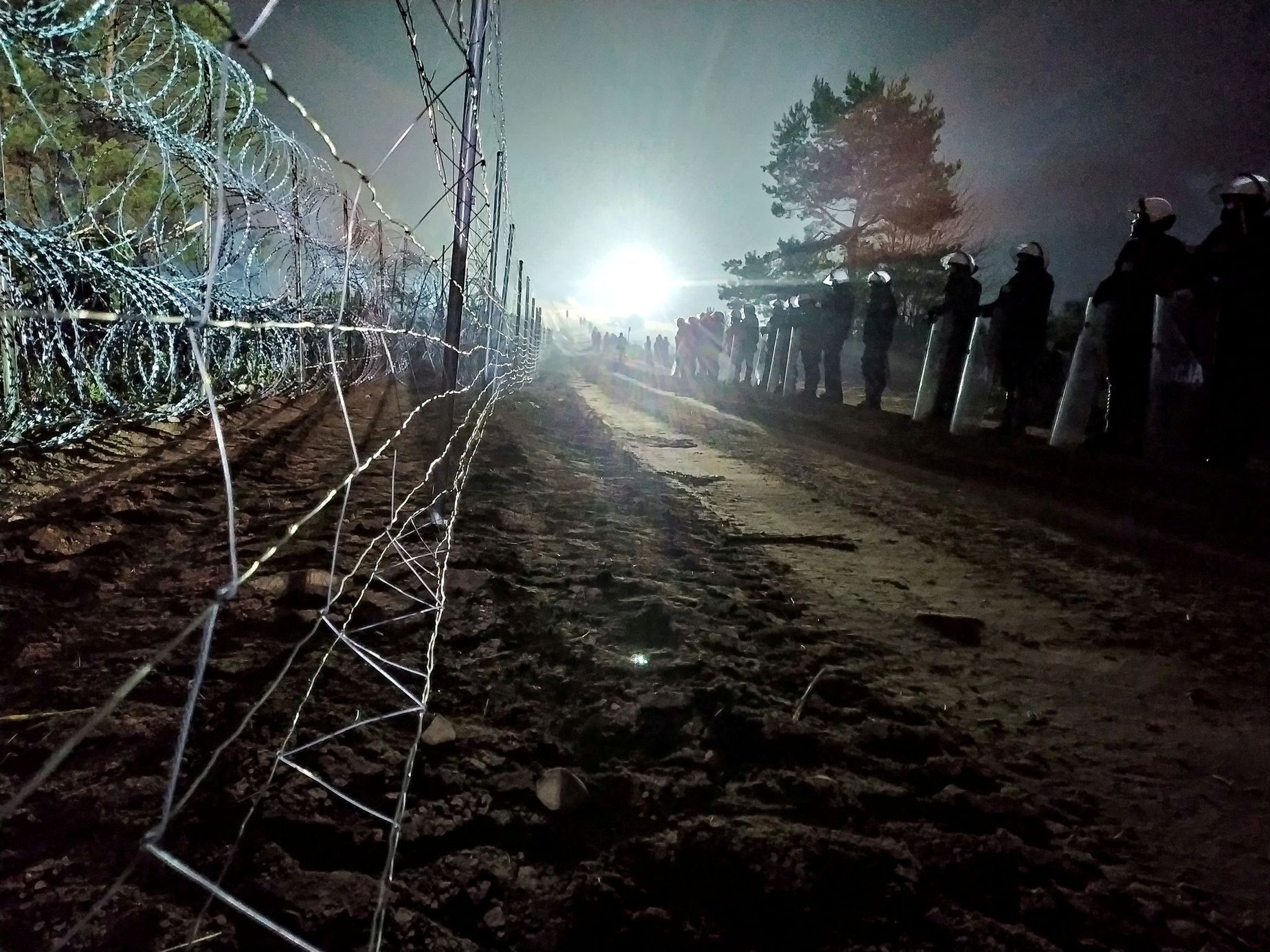 Polsko-běloruská hranice je obehnaná ostnatým drátem a ostře hlídaná i v noci.