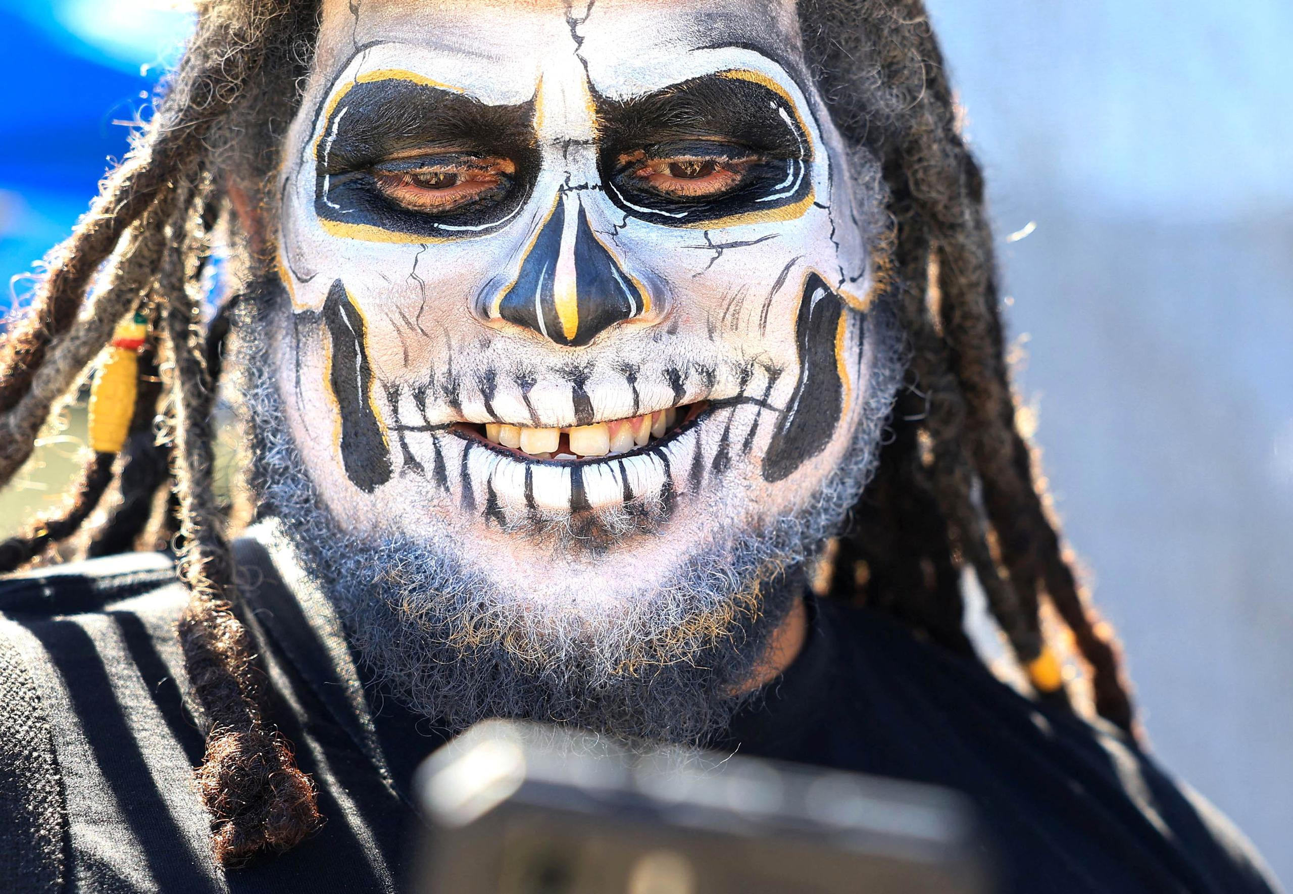 Kapské Město, Jihoafrická republika: Pestrobarevné kostýmy, smích a mobil v ruce, účastník se chystá na tradiční Cape Town Minstrel Carnival, nejveselejší den v roce.