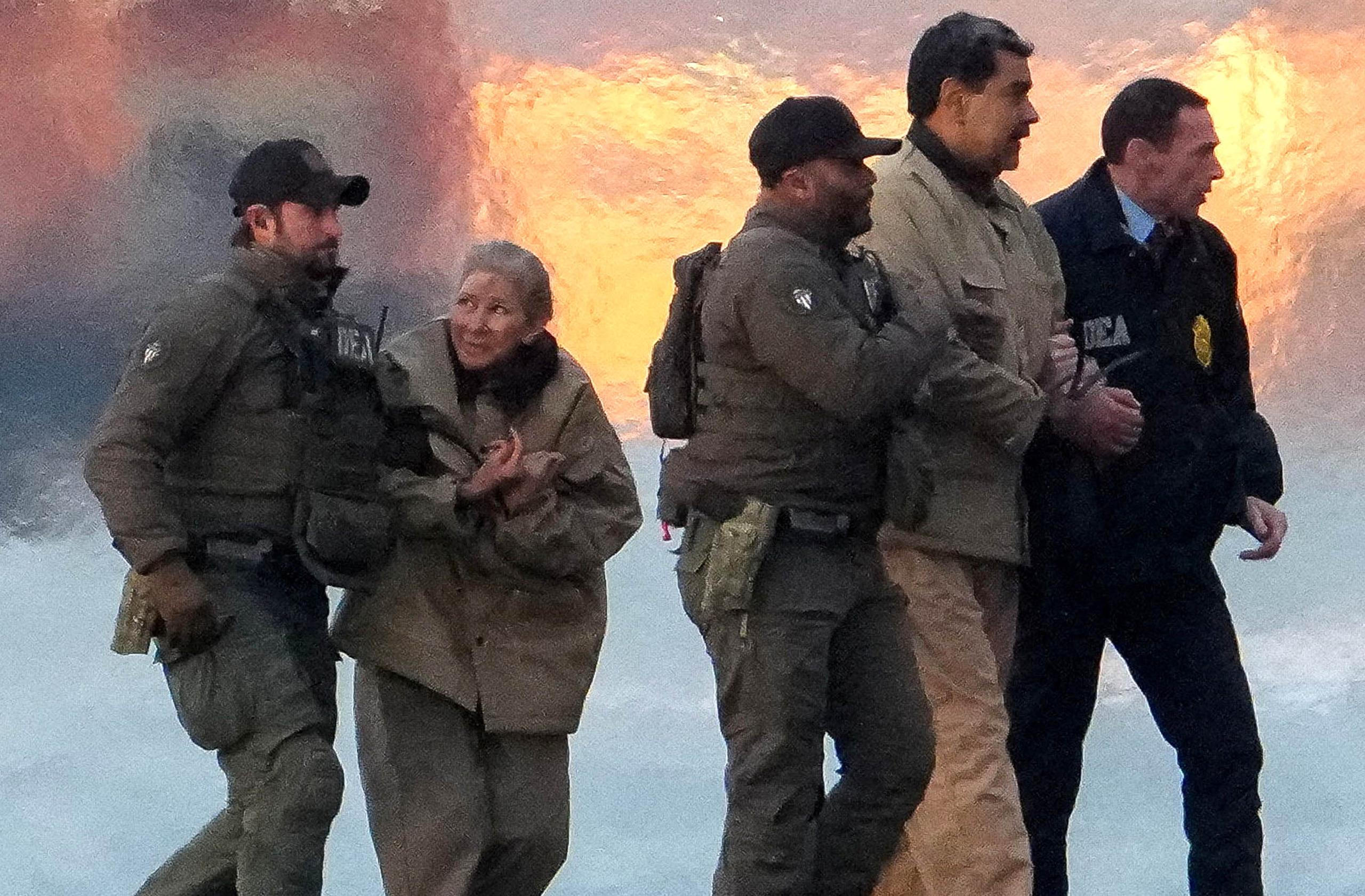 New York, USA: Dramatický okamžik, agenti DEA odvádějí z vrtulníku venezuelského prezidenta Nicoláse Madura a jeho ženu Ciliu Flores. Před soudem v Manhattanu čelí obvinění z obchodování s drogami a praní špinavých peněz.