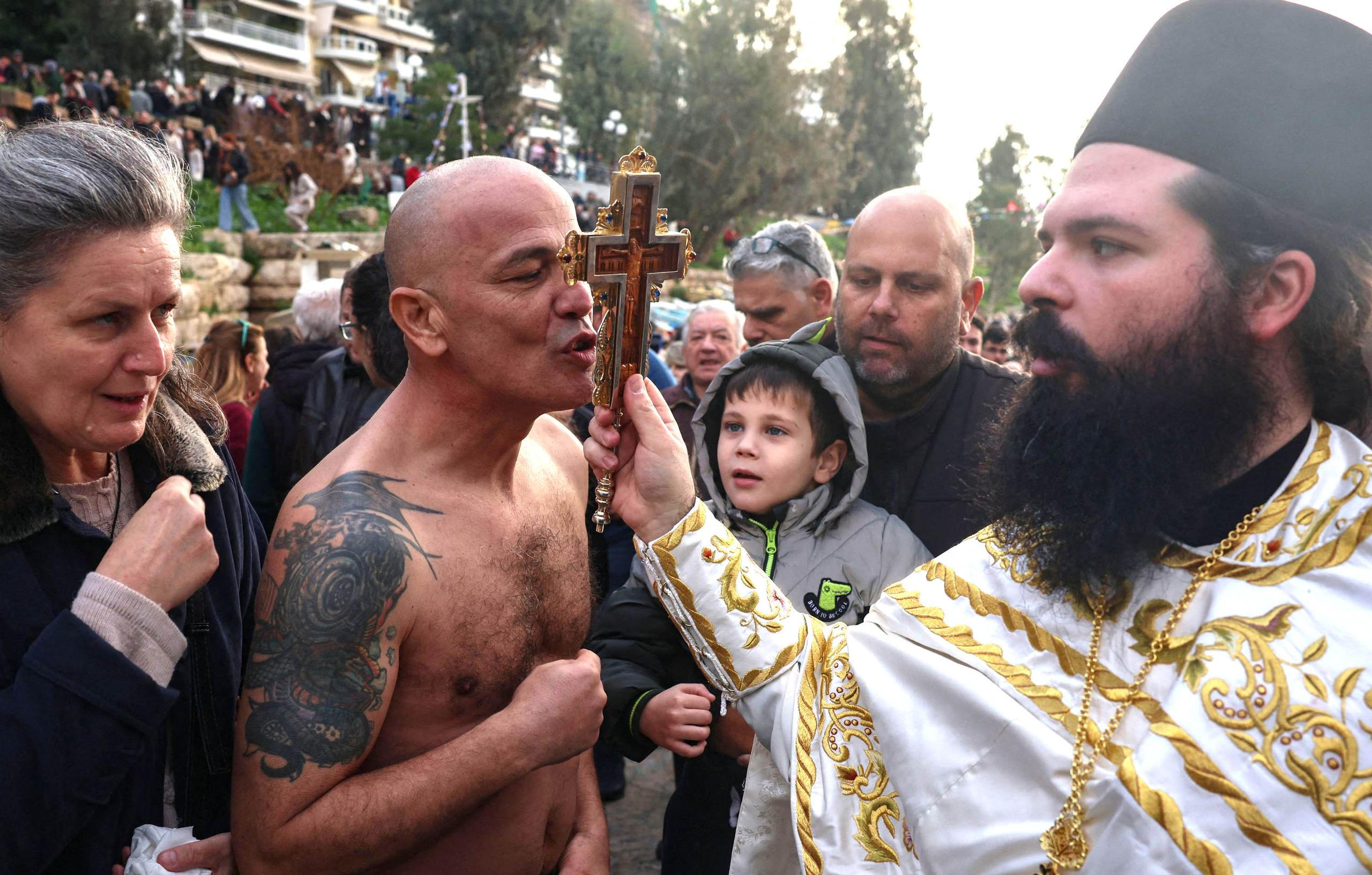Pireus, Řecko: Dotek víry a tradice. Ortodoxní věřící líbá kříž při obřadu svěcení vody u příležitosti svátku Zjevení Páně.
