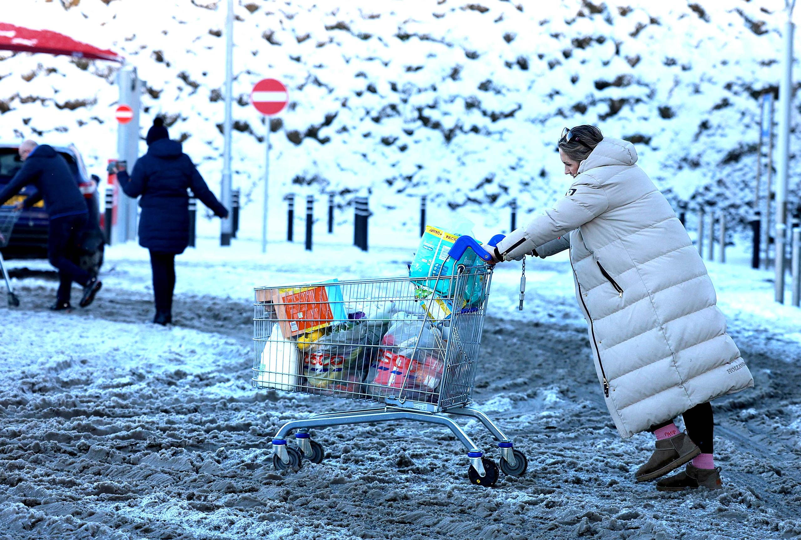 Ballymena, Severní Irsko: Zima ukázala svou sílu. Žena se probíjí sněhem s vozíkem, zatímco meteorologové prodlužují varování před ledovkou a mrazem.