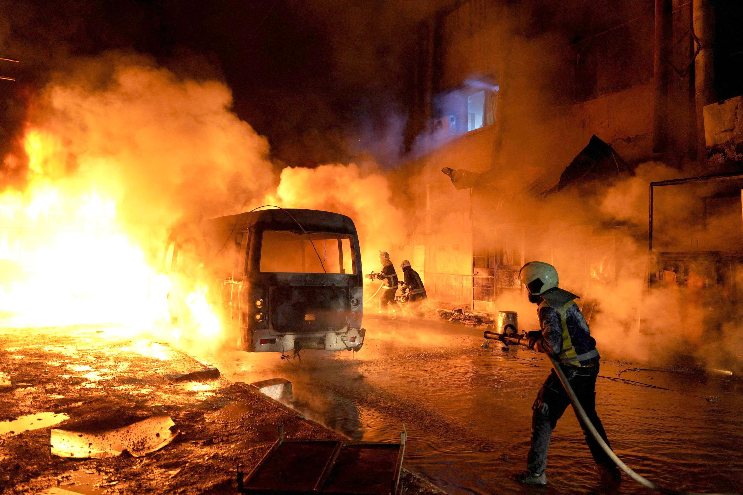 Aleppo, Sýrie: Oheň a chaos po dalším ostřelování. Dobrovolníci ze Syrské civilní obrany zasahují v troskách domů po obnovených střetech mezi armádou a kurdskými jednotkami.