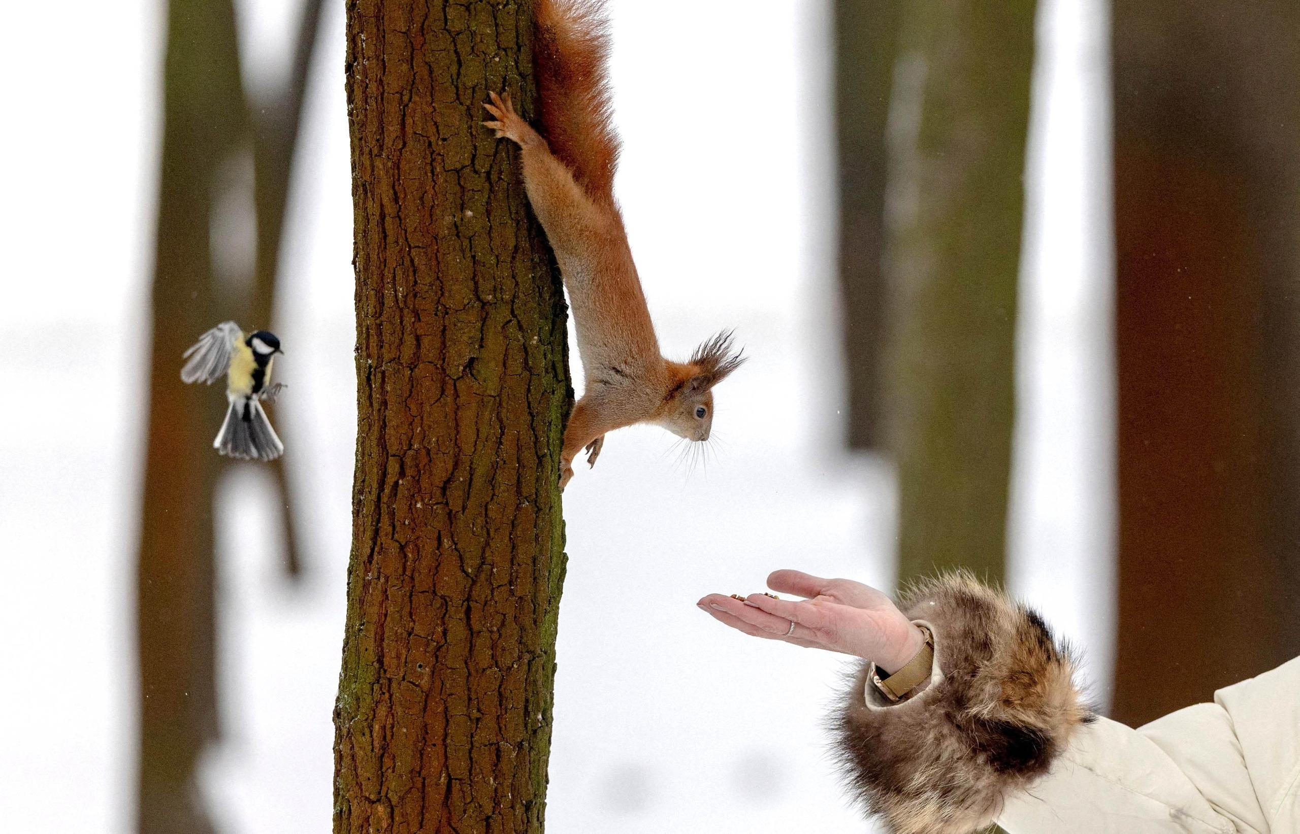 Kyjev, Ukrajina: Chvilka klidu uprostřed války. Žena krmí veverku v zasněženém parku, zatímco městem zní varování před dalšími útoky.