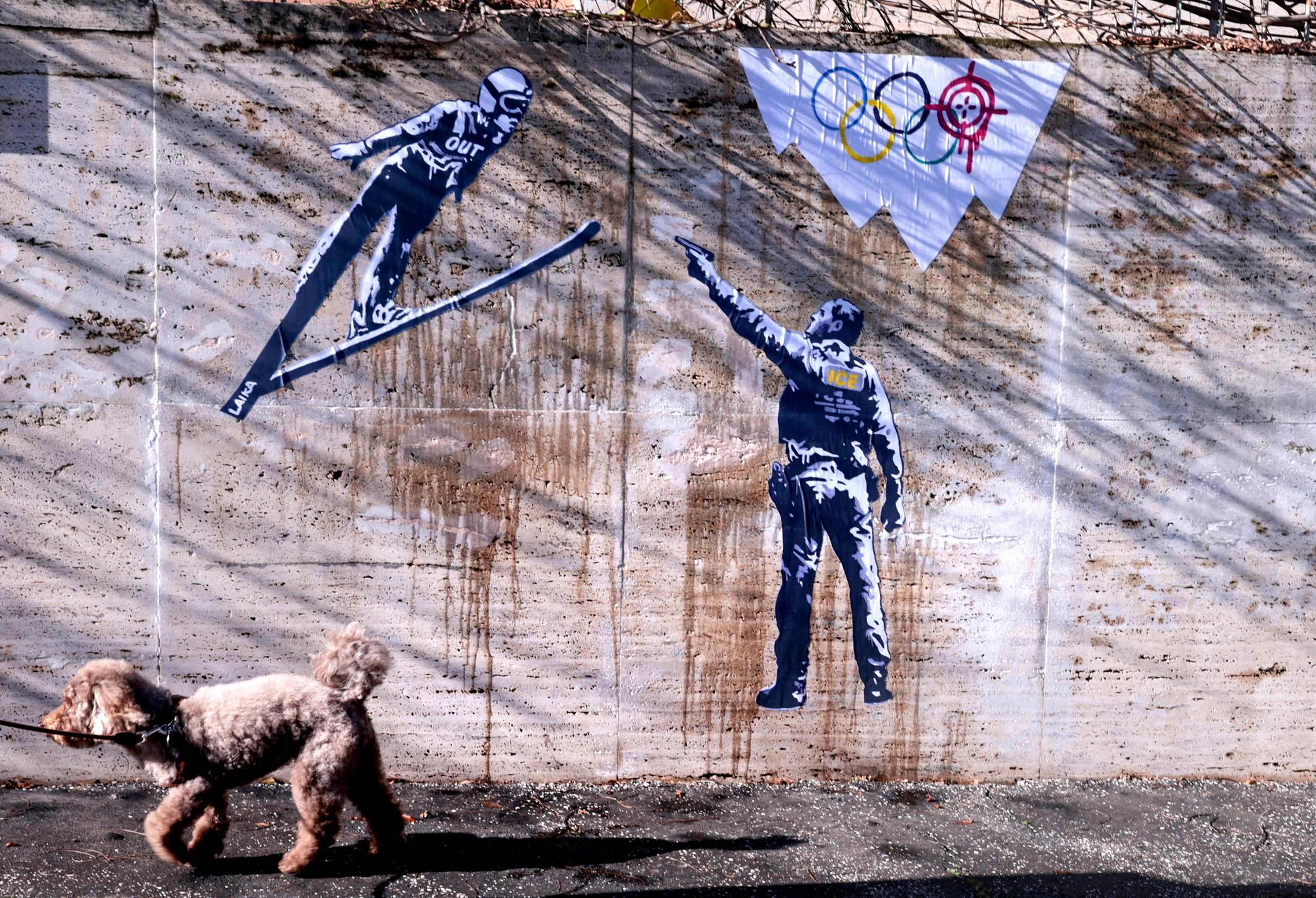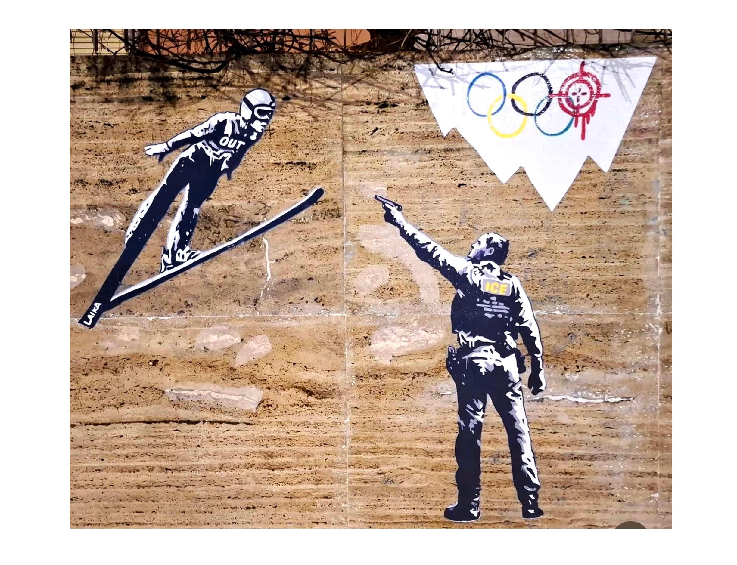 Římská streetartová umělkyně Laika vytvořila nové angažované dílo protestující proti přítomnosti pracovníků americké imigrační a celní správy (ICE) na zimních olympijských hrách v Miláně a Cortině.