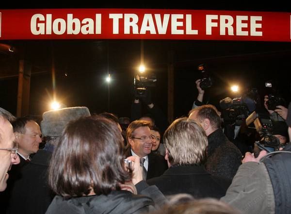 TAK PADALA ČESKO-RAKOUSKÁ HRANICE: Ministři vnitra Česka a Rakouska - Ivan Langer a Günther Platter - se sešli na půli cesty mezi českou a rakouskou hranicí v Mikulově. Stylově před duty free shopem.