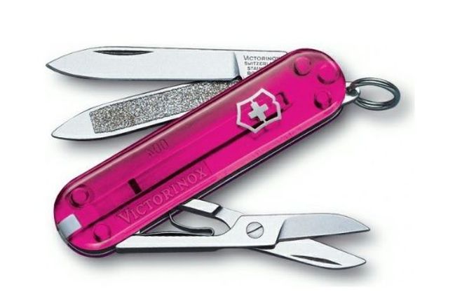 Klasický švýcarský nůž Victorinox v růžovém balení se podle výrobce hodí pro ženy, protože má navíc pilníček, nůžky, čistítko na nehty i pinzetu.