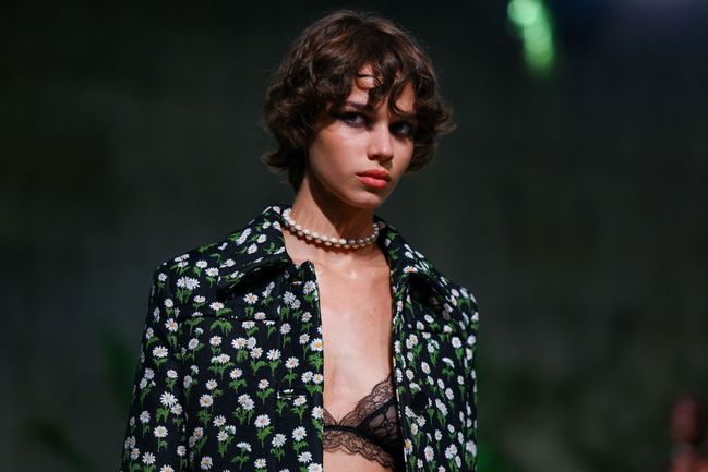 Italská móda vždy klade důraz na luxusní látky, zejména když přijde na spodní prádlo. Tuto svou silnou stránku návrháři posléze rádi předvádějí i na přehlídkách haute couture. Krátký kabátek z gabardénu zdobily květinové motivy heřmánku.