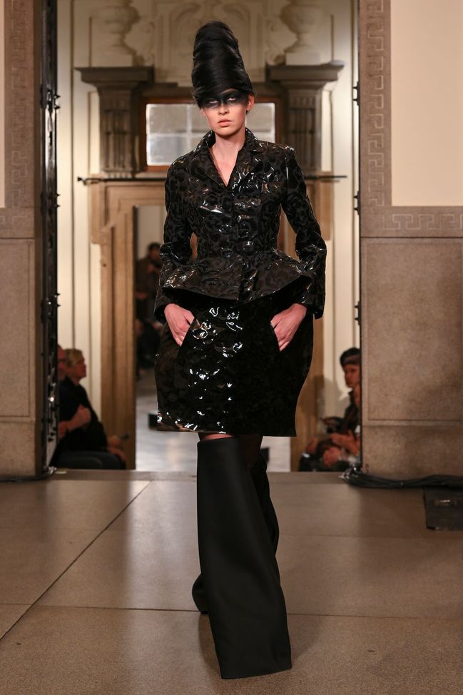 Černá barva, tolik oblíbená Liběnou Rochovou, tentokrát ve své další ohromující podobě: jako lesklý kostýmek neotřelé siluety doplněný návleky.