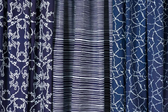 Tvary a obrazce, které se otiskávaly na textilie, se vytvářely v nejrůznějších podobách a motivech. Zde kupony z kolekce látek zhotovené ve spolupráci s dílnou Strážnický modrotisk od Petry Gupta Valentové.