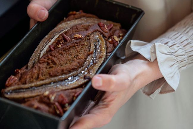 - Banánový chlebíček pečte přibližně 50-55 minut a před koncem pečení nezapomeňte překontrolovat dřevěnou špejlí.