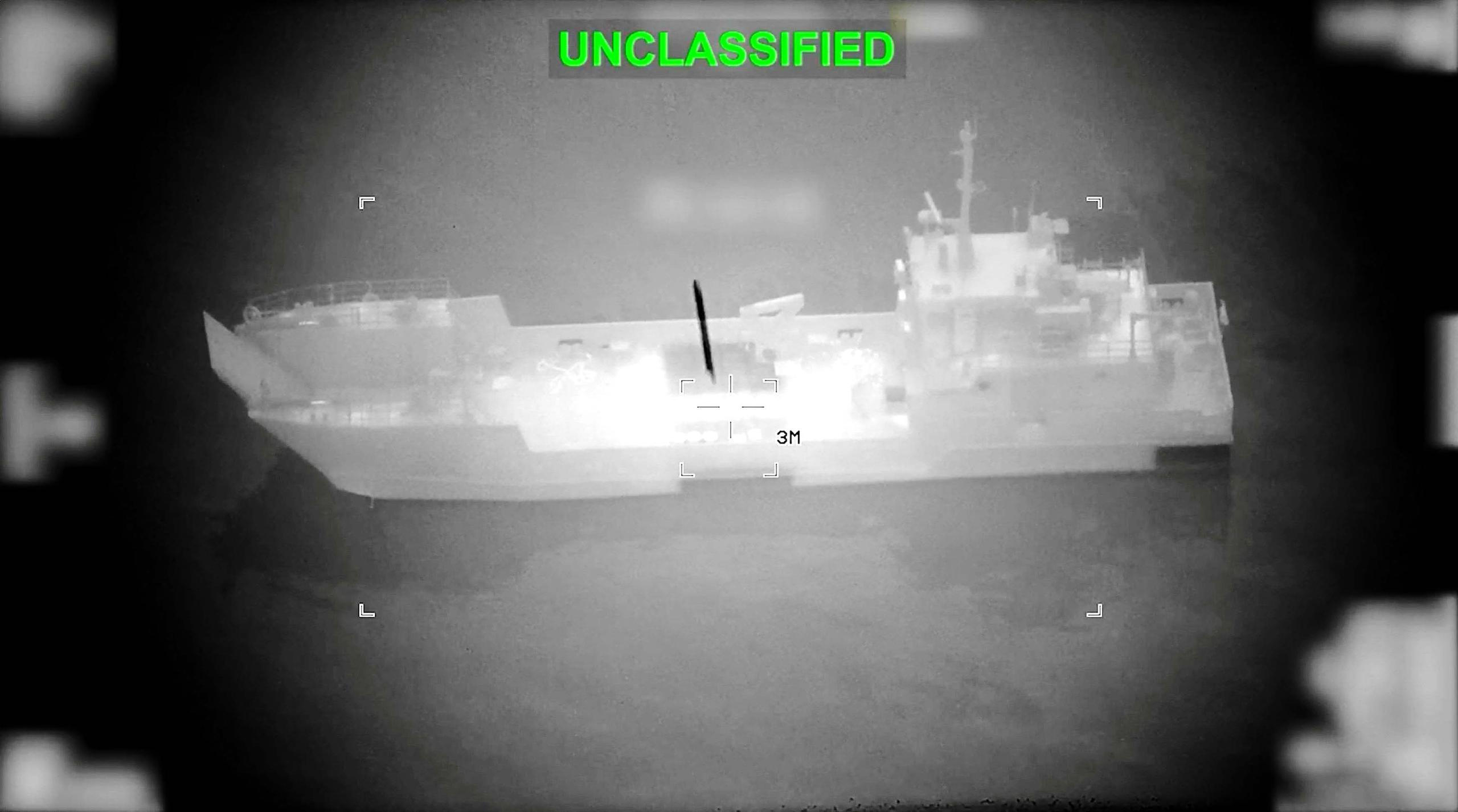 A projectile approaches what U.S. Central Command (CENTCOM) says is an Iranian naval vessel, during strikes that included attacks on mine-laying vessels, at a location given as near the Strait of Hormuz