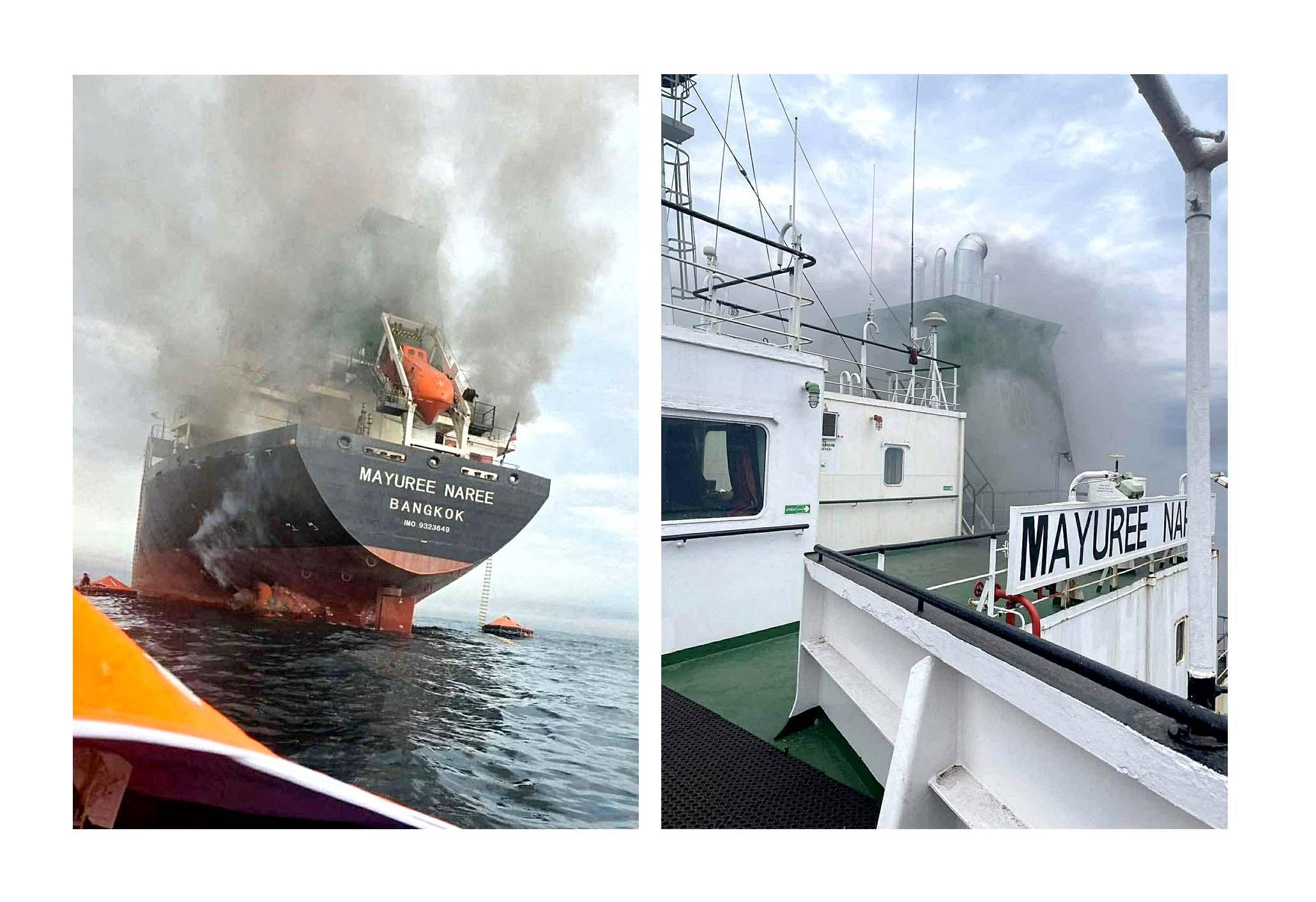 Hořící nákladní loď v Hormuzském průlivu.